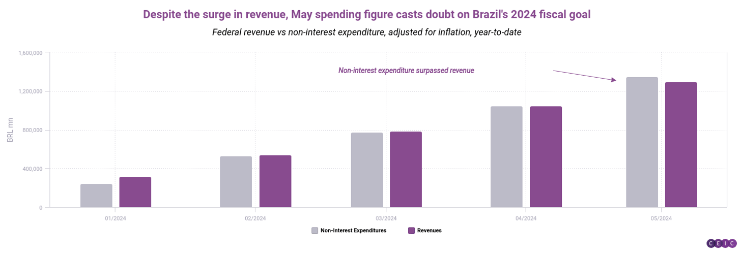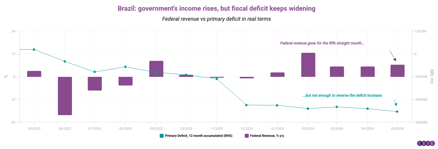 Brazilian GDP growth accelerated to 2.5% in the first quarter of 2024, up from 2% in the previous two quarters. The natural increase in tax revenue that resulted was bolstered as the government wound down a program of temporary relief on fuel taxes.