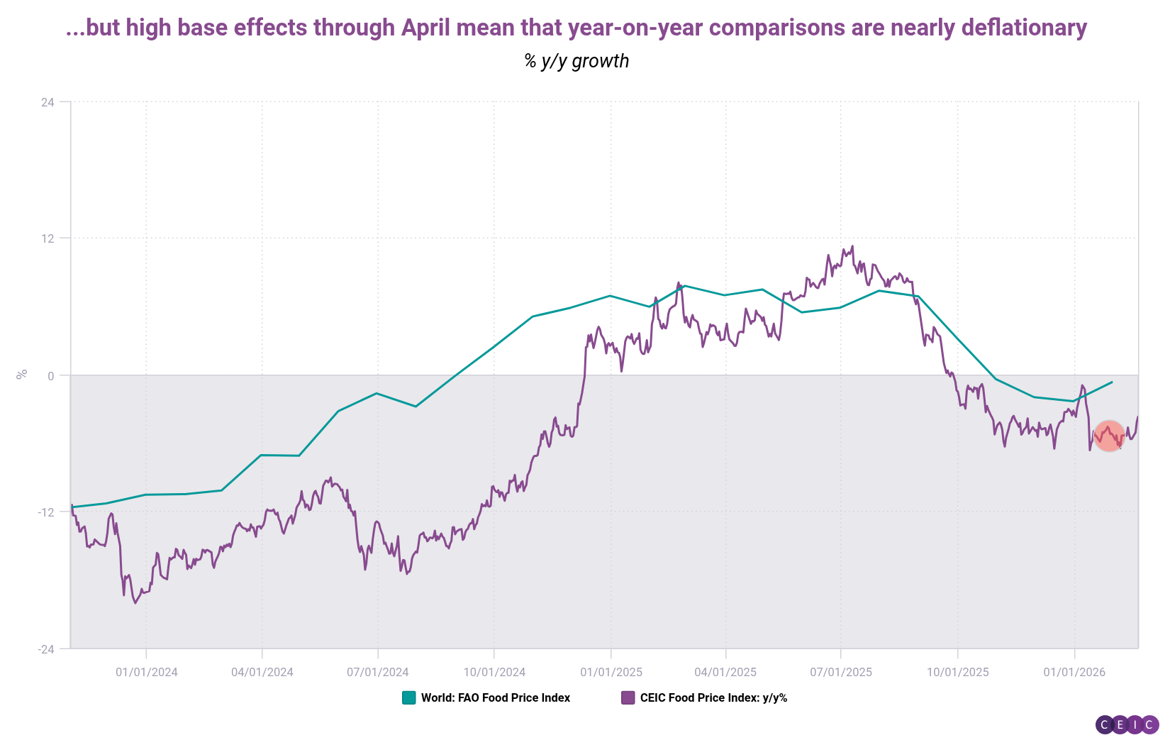 CEIC's Food Commodity Price Index compiles high-frequency food-price sources and tracks the FAO's methodology. It's anticipating flat growth for the FAO's measure in February. Base effects are a factor, reflecting last year's surging prices for wheat and rice.
