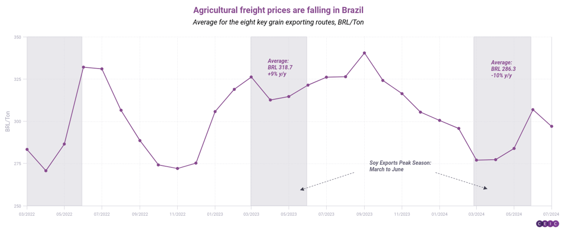 We've highlighted the March to June period -- the peak season for soy exports. In 2022 and 2023, freight prices saw a run-up around the time of this peak demand.