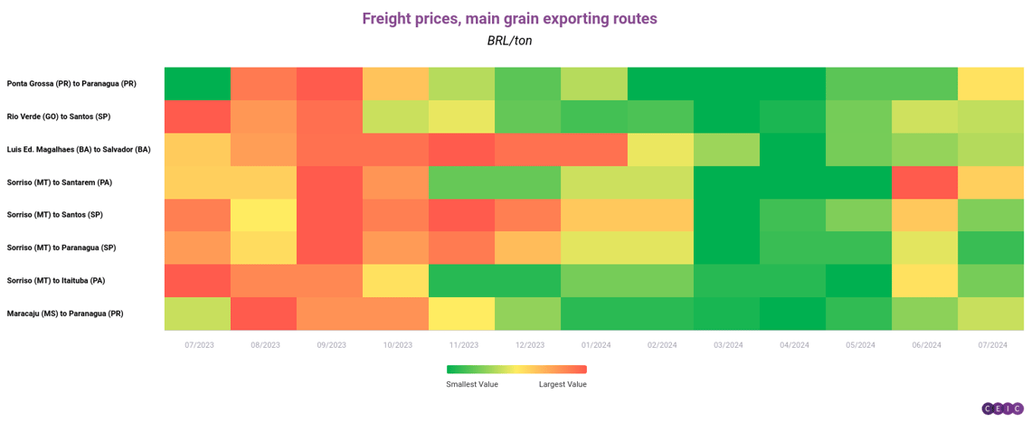 Our second chart is a heat map breaking down freight prices by route over recent months. The green cells recently show how freight prices appear to be consistently lower, regardless of region; for instance, routes originating from the key soybean state of Mato Grosso — located in the heart of the continent — saw reduced freight costs for northerly routes ending at the Amazon River ports of Santarem and Itaituba, as well as those terminating at the southern Atlantic ports of Santos and Paranagua.