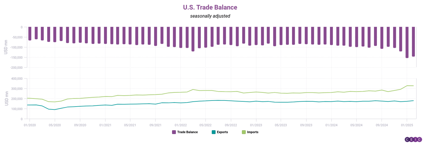 On Feb. 28, the Census Bureau's Advance Economic Indicators Report showed the US trade deficit surging 25.6% to a record USD 153.3 billion in January. (That was later revised to 27.4% and USD 155.6 billion.) Goods imports jumped 11.9% to an unprecedented USD 325.4 billion. (Again, this was revised upward, to 12.5% and USD 327.1 billion.)