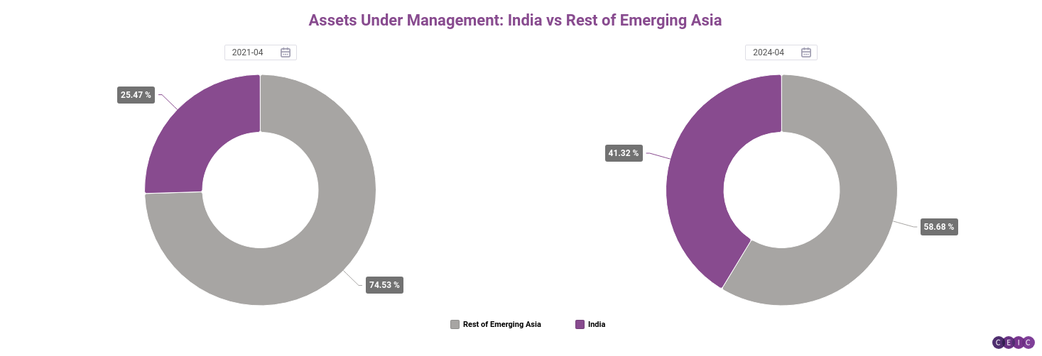 As our second chart shows, India's share of the equity funds under management for emerging Asia as a whole has surged. India accounted for 41.3% as of April 2024, up from 25.5% three years earlier.