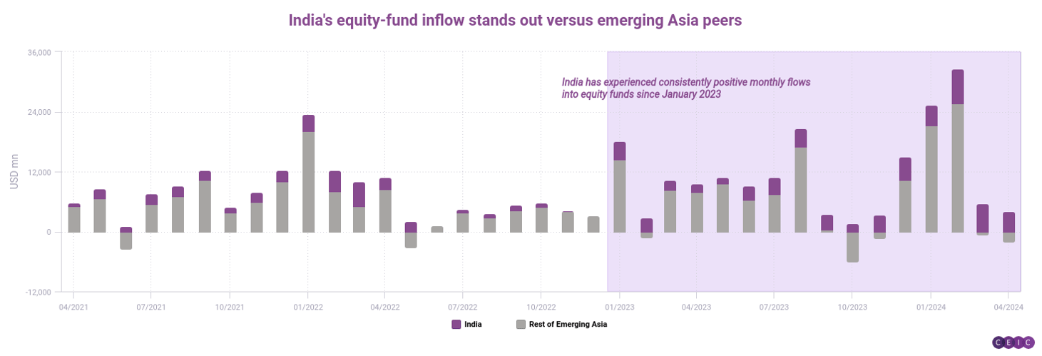 Data from EPFR shows India had registered 16 consecutive months of positive equity fund flows as of April. In February, the USD 7 billion inflow was a record for a single month.
