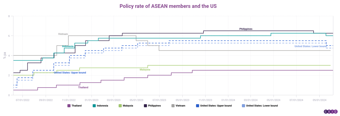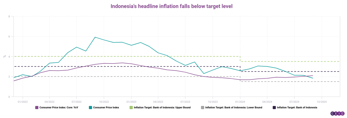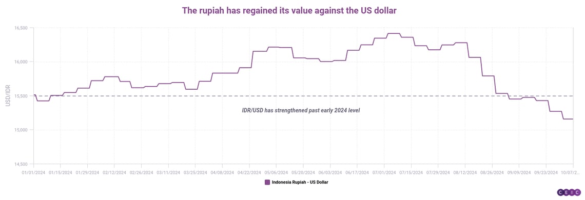 With the rupiah regaining the value it had lost against the US dollar earlier in 2024, and headline inflation remaining below the central bank’s target since July, Bank Indonesia has achieved its objective of stabilizing the currency. Additionally, the dovish messaging from the Federal Reserve, which recently enacted a 50-basis-point cut, likely supported Indonesia's decision to ease monetary policy.