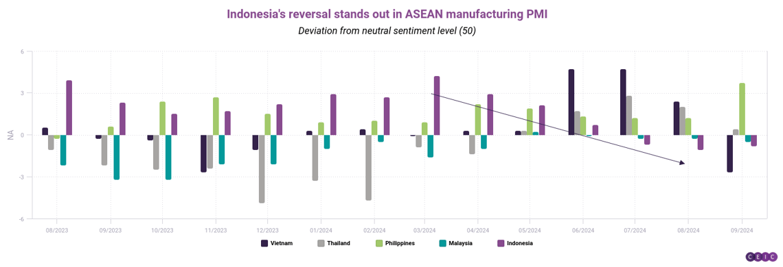 Our final chart shows another reason for the urgency of Indonesia's move. Comparing the purchasing managers' index (PMI) manufacturing surveys of ASEAN nations, negative sentiment in Indonesia stands out: PMI has worsened sharply since April and been outright pessimistic since July.