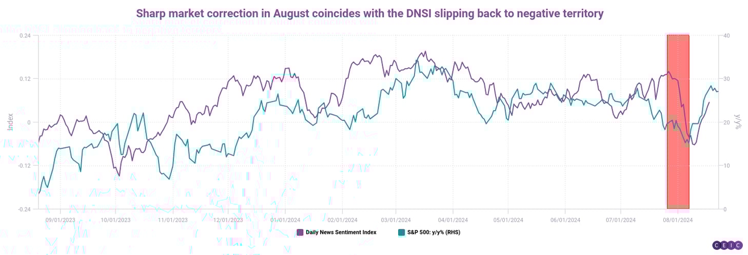 The DNSI has been in negative territory for much of the past three years, reflecting real-time worries about Covid-19 and the implications of the Fed's 2022 rate hikes. It ticked lower during the recent debt-ceiling standoff and rebounded when a Congressional act relieved that crisis. Most recently, it has reflected optimism that the Fed will finally start cutting rates, though the July-August market selloff resulted in a downward spike.