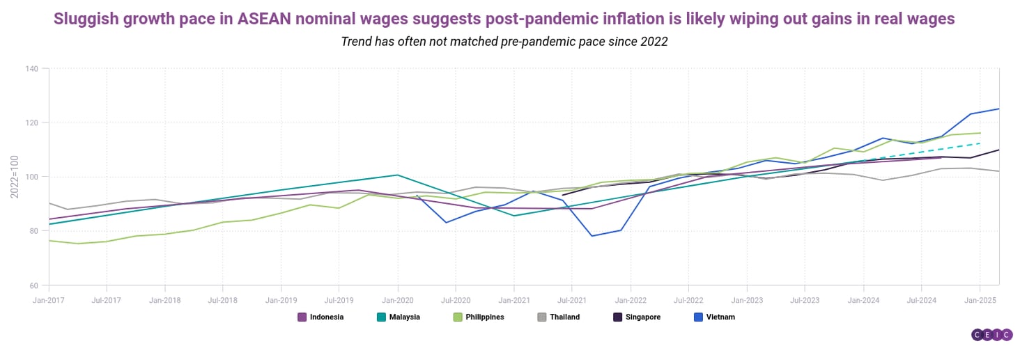 Real wages among ASEAN-6 countries have remained broadly stagnant, with nominal increases offset by a rising cost of living. This is particularly the case for Indonesia, Singapore and the Philippines -- but even high-income Singapore is not immune.